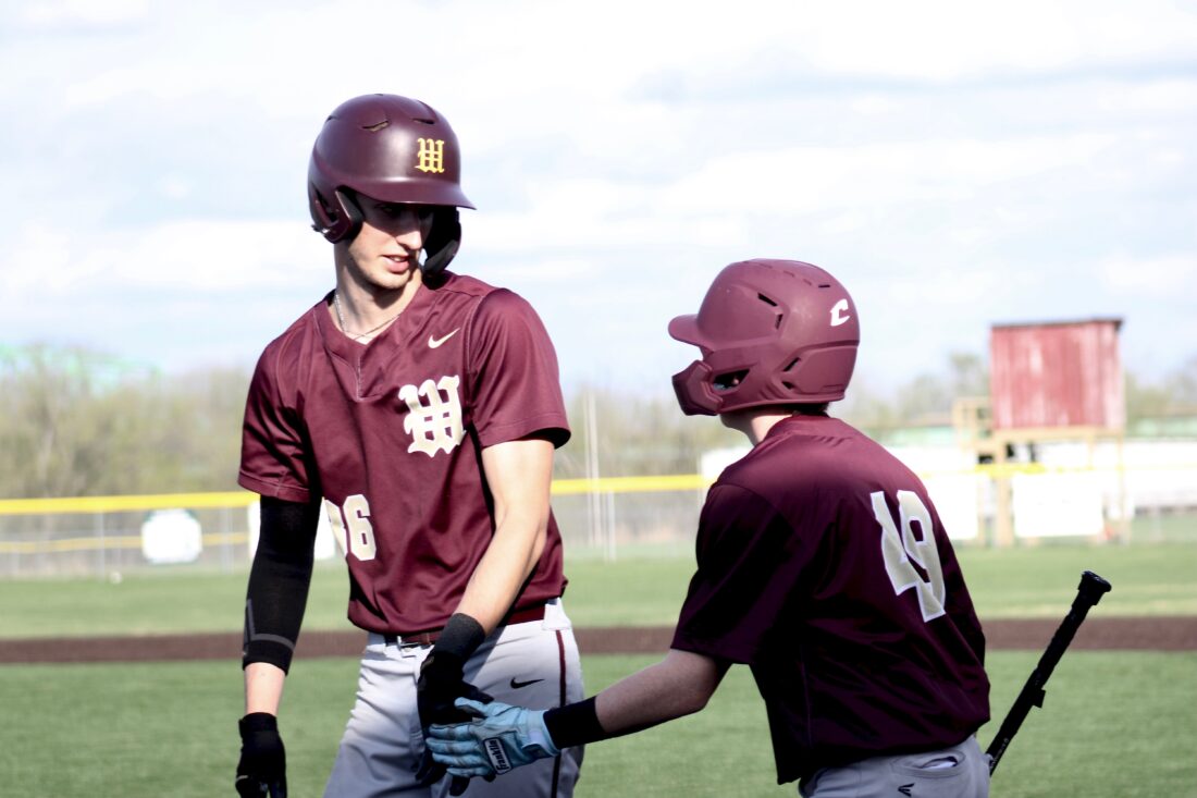 - Williamstown’s Tyler Keiser, left, is greeted at home plate by Colten Rinard after scoring a third-inning run during the Yellowjackets’ game against Tyler Consolidated, Friday at William “Bill” Coiner Field. (Photo by Kerry Patrick)