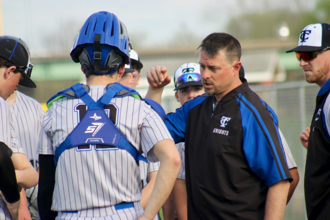 - Tyler Consolidated baseball coach Robby Jones hold a team meeting outside the dugout during Friday’s game against Williamstown at William “Bill” Coiner Field. (Photo by Kerry Patrick)