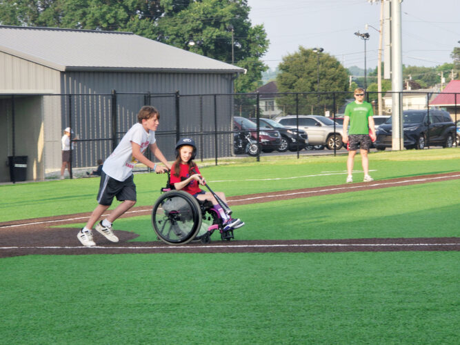 PARKERSBURG — Kamren and Aryaunna Coffey rush to first base at Friday evening’s Miracle League of the Mid-Ohio Valley Demonstration Game. The Miracle League is an organization striving to make baseball inclusive for those with disabilities. It will also hold an ice cream social from 5-8 ...
