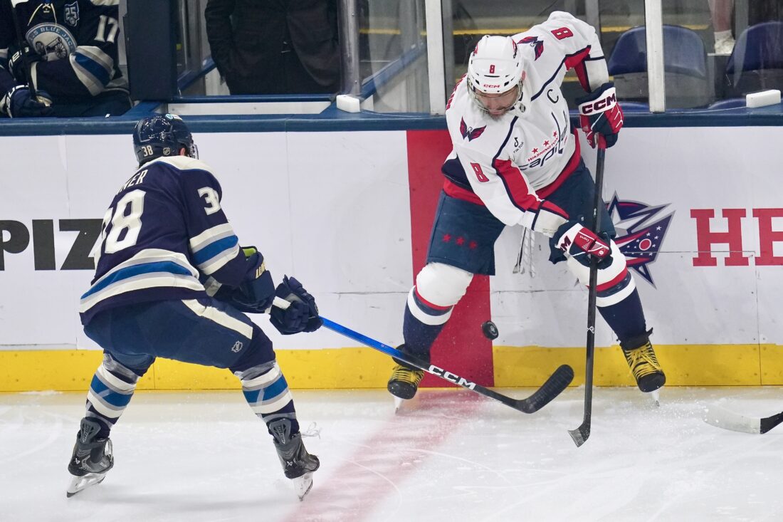 Washington Capitals left wing Alex Ovechkin, right and Columbus Blue Jackets center Boone Jenner (38) reach for the puck in the first period of an NHL game Tuesday in Columbus, Ohio. (AP Photo/Sue Ogrocki)