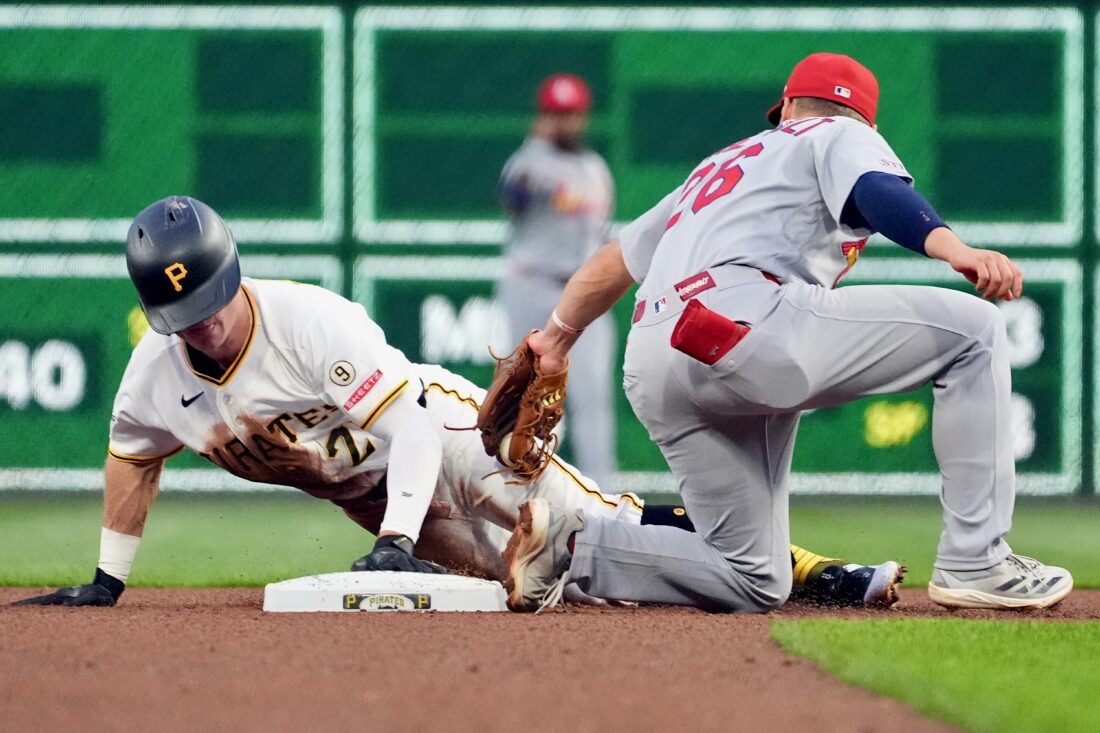Pittsburgh Pirates' Jake Mangum, left, slides under a tag by St. Louis Cardinals second baseman JJ Wetherholt, right, for a stolen base in the fourth inning of a baseball game Monday in Pittsburgh. (AP Photo/Tom E. Puskar)