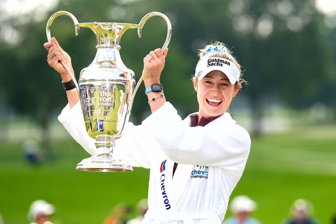 HOUSTON (AP) — Nelly Korda is back to No. 1 in the world and looks every bit the part. Korda was so untouchable at The Chevron Championship that no one got closer than four shots of her the entire weekend. She played her last 29 holes at Memorial Park in even par and still won by five, the largest margin at this major in 18 years. And it was one of the toughest times she ever had. “It’s not easy going in with that big of a lead,” said Korda, “I think that was the challenging point with like, where do I still play like Nelly and where do I play a little defensive?” That’s why where was much relief as joy when she holed a 7-foot par putt to close with a 2-under 70 to capture her third major championship and return to No. 1 in the women’s world ranking for the first time since August. She celebrated in the best manner possible — a cannon ball into the 4 1/2-foot pool built to the right of the 18th green to keep with the tradition at this major that dates to 1988 when the winner jumped into Poppie’s Pond at Mission Hills in the California desert. “Feet first,” she said with a smile, dressed in the winner’s white robe. “I knew it was 4 feet, so I was expecting to hit the ground very fast.” No one else expected anything else. Staked to a five-shot lead at the start, Korda was efficient as ever with two early birdies, and two more on the back nine that put the final touches on this masterpiece. Playing it safe left her a couple of par putts in the 6-foot range, the ones that had given her fits in the third round. She made one on the 11th. She left the next one short, and her lead was down to four shots. Time for Nelly golf. Her caddie told her she should play well short of the pin on the heavily contoured green at the 13th. Korda had other ideas. “I actually just sent it at the pin and I had a tap-in birdie,” she said. Korda followed by hammering a 3-wood to just short of the green for a simple up-and-down for birdie. And then it was back to playing it safe — so conservative that instead of hitting a mid-iron onto the par-5 16th over water, she opted to lay up with a gap wedge and then hit lob wedge to 25 feet for a two-putt par. The victory was her 17th on the LPGA and 21st worldwide. Not since Meg Mallon in 2000 had an American reached three majors in her career, and the 27-year-old Korda is just getting started. She doesn’t care for comparisons with her 2024 season when she won seven times, including that record-tying streak of five in a row that was capped off at The Chevron. But it’s the start to a season that will get everyone’s attention. She has played in the final group in all five of her tournaments, winning twice and being runner-up the other three times. And then she won a major by leading the final 57 holes of the tournament. Korda joined Juli Inkster (1989) and Amy Alcott (1991), both at Nabisco Dinah Shore, as the only players in the last 50 years to win LPGA majors when leading by multiple shots after each round. About the only drama in the final hour — all weekend, really — was whether Korda could break Dottie Pepper’s 72-hole scoring record that has stood since 1999. Korda was playing it safe with a big lead, hitting to the fat of the green and settling for pars, along with another three-putt bogey. She finished at 18-under 270, one short of Pepper’s record at Mission Hills. Korda made a 25-foot birdie putt on the 12th hole Friday, and didn’t make another putt over 10 feet the rest of the week. That included a trio of 4-foot misses that kept it from being a blowout, and it stayed in her heard. But that was part of Korda’s new outlook. Don’t worry about mistakes, knowing she could make up for them, and she did. ‘What I was telling myself was I really want to hoist this trophy because I want to show the kids at home that it’s OK to miss short putts and still win a major championship,” she said with a laugh. “You’re going to make mistakes. You have to mentally still be in it 100%, and that’s really what I wanted show. “I wanted to show it to myself and I wanted to show it everyone looking up to me.” Ruoning Yin (69) and Patty Tavatanakit (70) tied for second. They were the only ones who could even think about having a chance on Sunday. Tavatanakit walked in a 25-foot birdie on the sixth hole to get within four shots, only to make bogey with a wedge on the par-5 eighth. Yin went 56 consecutive holes without a bogey until making one on the 17th. Korda won $1.35 million for a victory that puts her back as the best in women’s golf without any debate. And now it’s off to the Gulf Coast of Mexico for the next LPGA event, taking Monday to celebrate and getting back to work on Tuesday. She loves competition. In this case, she was competing mainly against her herself. It was a big win in many ways because she had self-doubts when she missed those short putts Saturday. Korda told her caddie she did not want those thoughts to creep in during the final round. “I want to go out and play golf. Whatever happens — if I jump into that pond, if I have the trophy in my hands at the end of the day — then great. I gave it 100%. If I don’t, then I have next week. I have the week after. “That’s going to be my mindset for the rest of the year.”