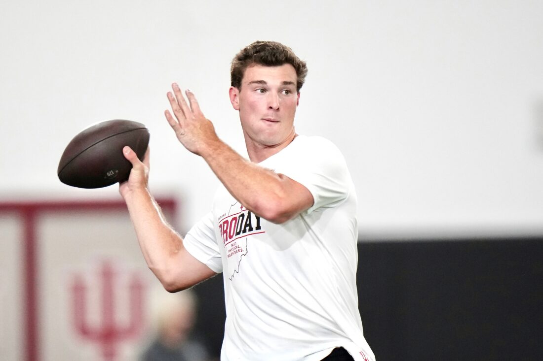 Indiana quarterback Fernando Mendoza looks to throw a pass during the school's NFL football pro day Wednesday, April 1, 2026, in Bloomington, Ind. (AP Photo/AJ Mast)