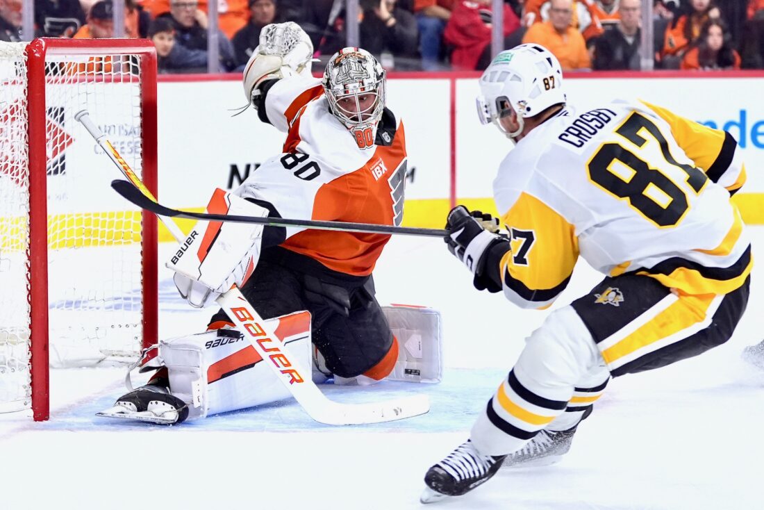Philadelphia Flyers' Dan Vladar, left, blocks a shot by Pittsburgh Penguins' Sidney Crosby (87) during the first period of Game 4 in the first round of the NHL Stanley Cup hockey playoff series Saturday in Philadelphia. (AP Photo)