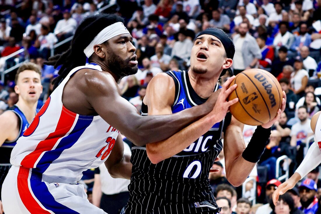 Orlando Magic guard Anthony Black (0) is fouled by Detroit Pistons forward Isaiah Stewart (28) while driving to the basket during the second half in Game 2 of a first-round NBA playoffs series Wednesday in Detroit. (AP Photo/Duane Burleson)