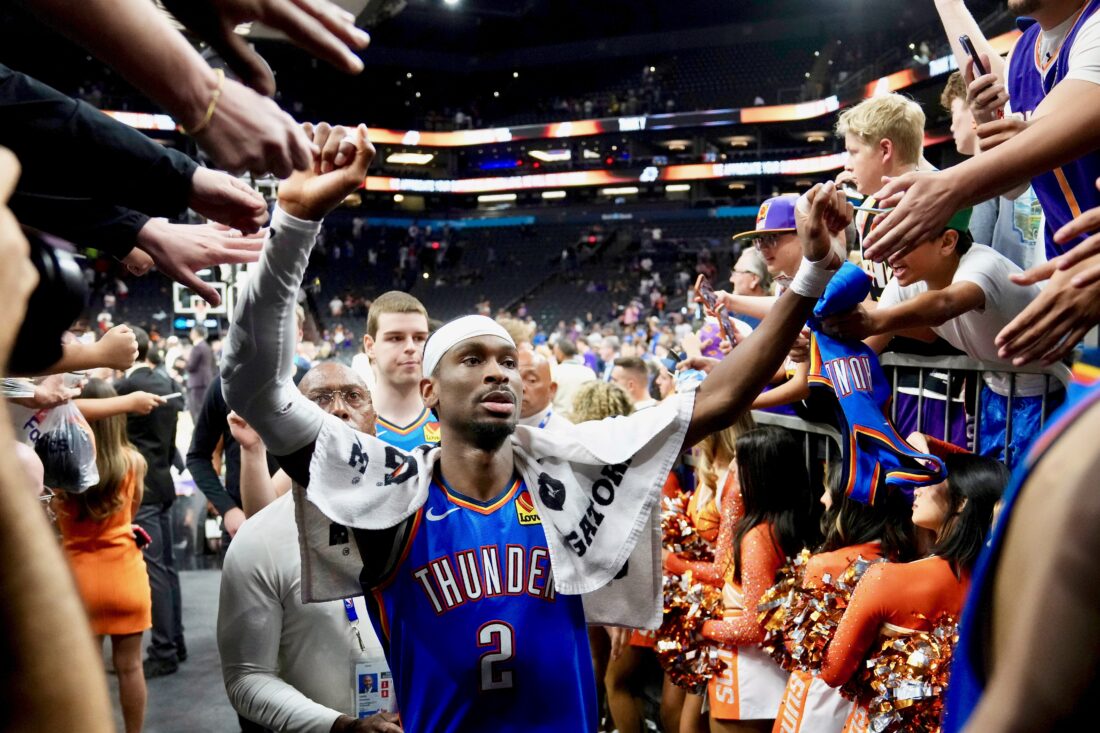 Oklahoma City Thunder guard Shai Gilgeous-Alexander celebrates with fans after Game 4 in a first-round NBA playoff series against the Phoenix Suns Monday in Phoenix. (AP Photo/Ross D. Franklin)