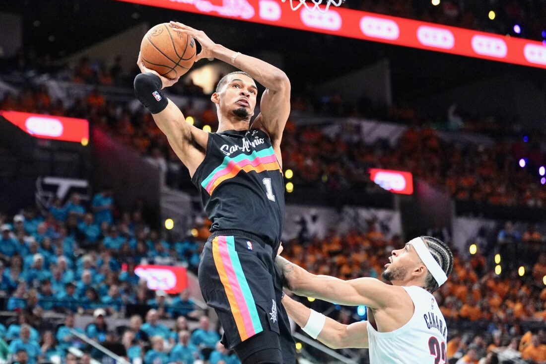 San Antonio Spurs forward Victor Wembanyama (1) drives to the basket over Portland Trail Blazers forward Toumani Camara (33) during the second half in Game 1 of a first-round NBA playoffs basketball series, Sunday in San Antonio. (AP Photo)