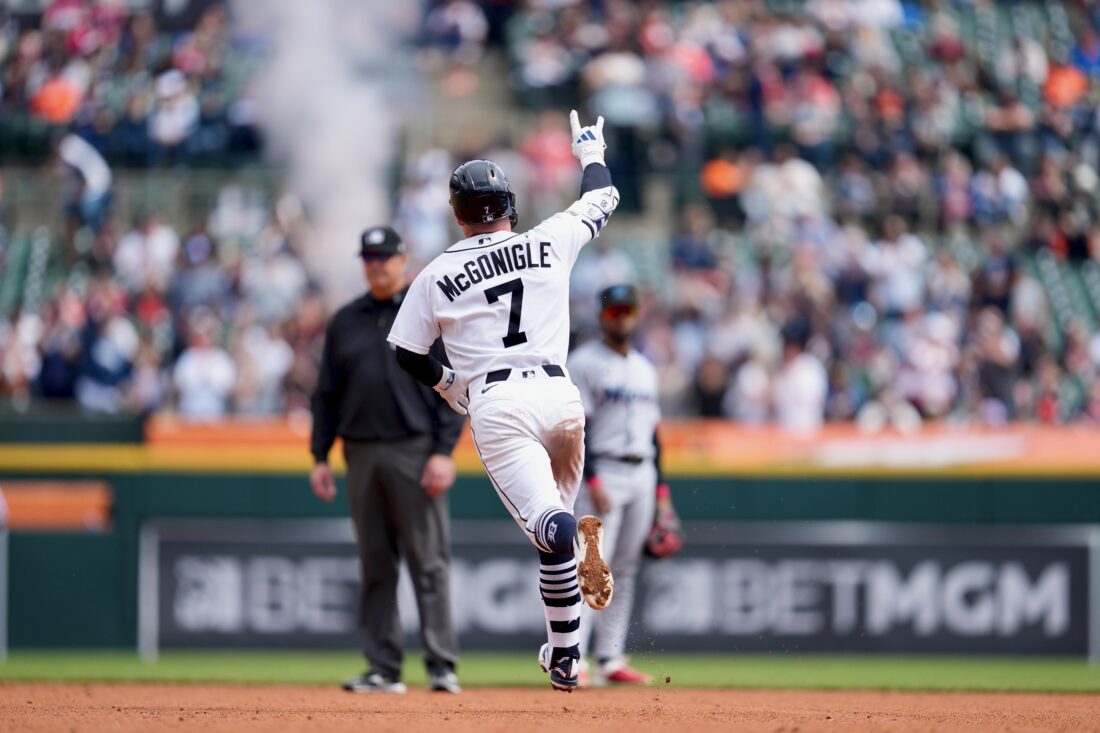 Detroit Tigers' Kevin McGonigle celebrates his home run against the Miami Marlins during the fifth inning of a baseball game Sunday in Detroit. (AP Photo/Paul Sancya)
