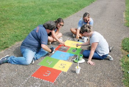 Chemours volunteers, clockwise from left, Dixie Farhatt, Grace Mousty, Erica Factor and Casey O’Donnell paint a hopscotch pattern on the Born Learning Trail at Belpre’s Depot Park Monday as part of the United Way’s Day of Action. (Photo by Evan Bevins)