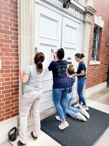 Volunteers from Thermo Fisher Scientific scrape paint on the door of the Betsey Mills Club in Marietta Monday as part of the United Way’s Day of Action. (Photo Provided)