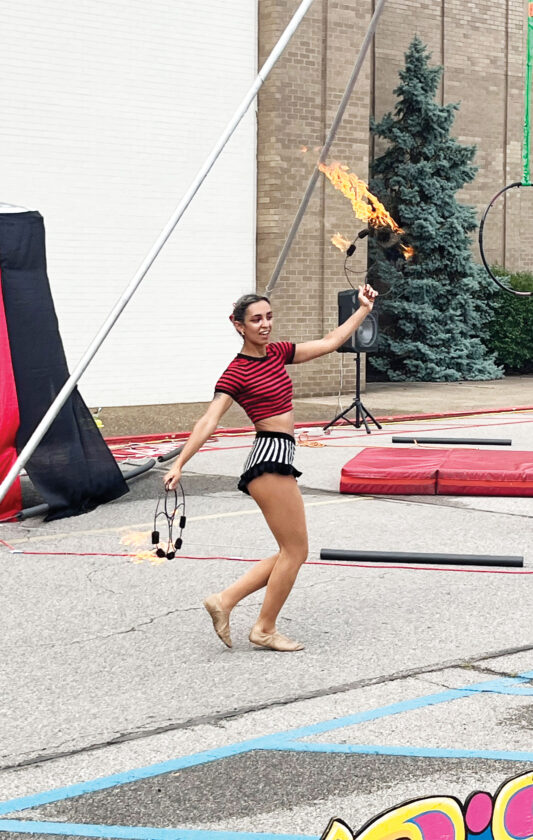 Stella Dionysiou, a performer with the Cincinnati Circus Company, dances with fiery rings during their performance at the third annual Freedom Festival Saturday at the Grand Central Mall. (Photo by Kristen Hainkel)