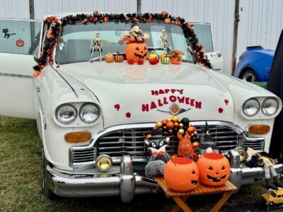 An antique car parked at the Mid-Ohio Valley Regional Airport during Trunk or Treat on Saturday. An orange sign on the car reads Happy Halloween. (Photo by Amber Phipps)