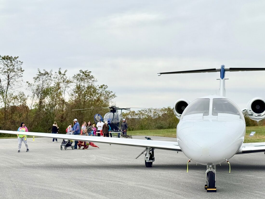- An aircraft is parked in the runway at the Mid-Ohio Valley Regional Airport as people trick or treat in the background on Saturday. (Photo by Amber Phipps)
